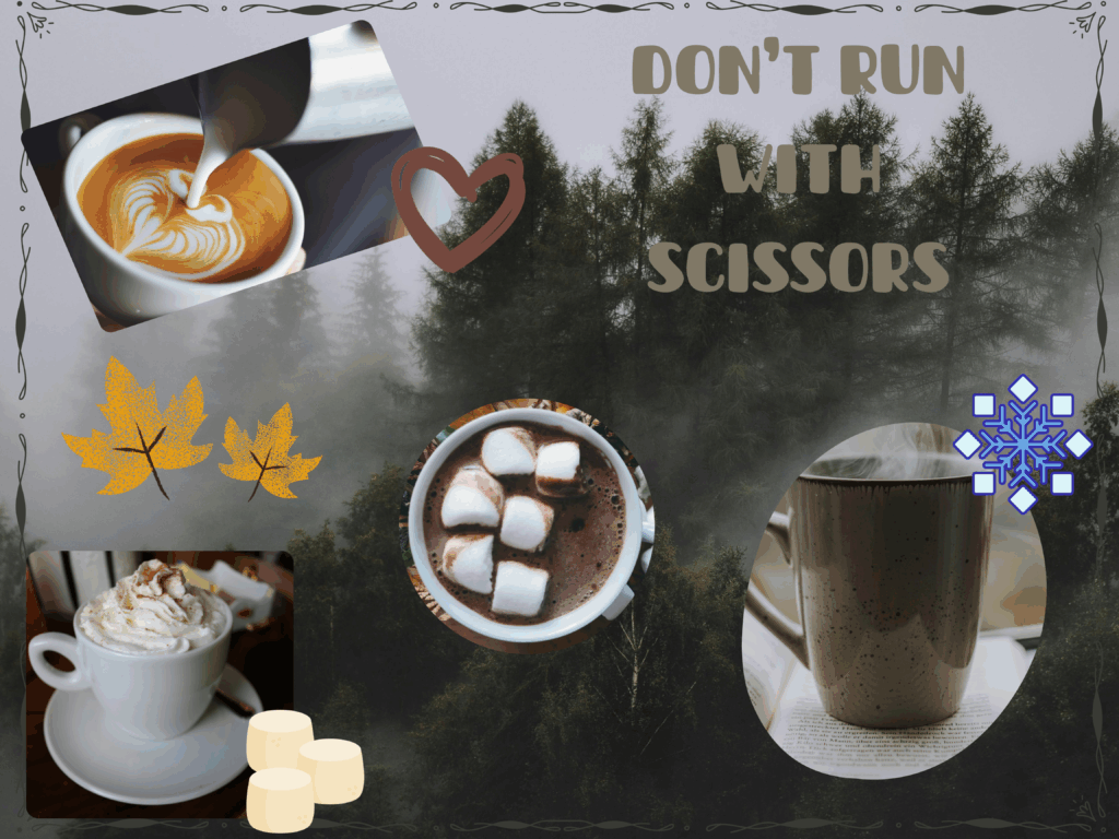 The image above is part of an assignment, Stay Home- Living is Dangerous. The purpose of the assignment is to create a graphic that conveys a certain theme or feeling. Then add text to it that contradicts the overall theme of the graphic. The theme of the graphic I tried to portray is feeling cold and finding comfort in hot drinks like coffee and hot chocolate. For the text, I thought to include something informative. Under no circumstance should you ever run with scissors and I think that is pretty much self explanatory. I grabbed images from Pexels and the png images from Freepik and Canva. I also used Canva to create the whole graphic. I found this assignment a bit challenging at first since I wasn’t sure how I wanted to spread everything out and I also didn’t want to rely on square images. I ended up using some of the shape options and corner rounding from Canva. I like the design I landed on and find it easy on the eyes.
