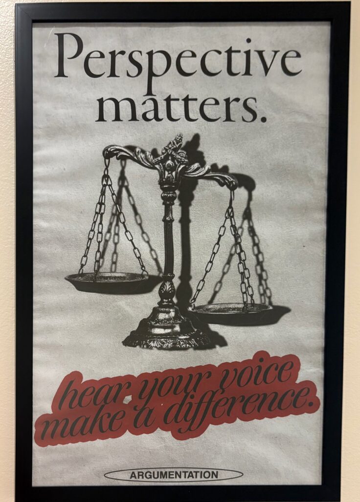 I saw this poster in one of the University of Mary Washington’s academic buildings. I immediately thought of the metaphor and symbol concept when I came across it. The symbol in the middle is the scale of justice, which is often referred to when hearing from both sides of a party and weighing what it implicates. For me, it also ties into the text at the top saying ‘Perspective matters.’ because depending on what side you are, you may be the ‘heavier’ or the ‘lighter’ side. Using metaphors and/or symbols can help give the viewer something to familiarize themselves with when looking at your design.