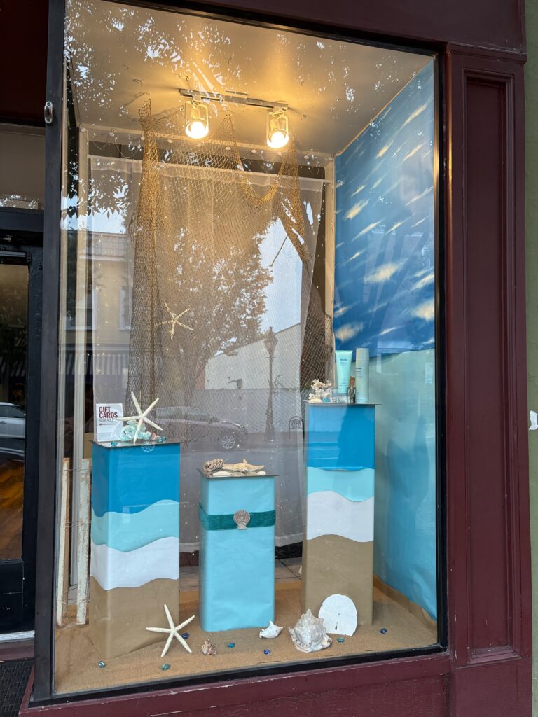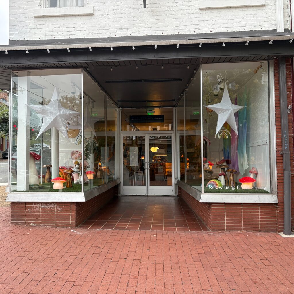 This storefront to me is minimalist compared to all the other storefronts I saw during my exploration of Downtown FXBG. There isn’t a whole lot going on in the entire case. You have hanging stars that take up a section of the upper half of the showcase. Then you have different kinds of mushrooms on the bottom with a fake grass like carpet. Minimalism is an important feature in many designs as it can help the viewer to not feel so overwhelmed with what is in front of them. Minimalist designs are easy on the eye and more digestible to take in. Negative space also allows for the emphasis of what is being showcased.
